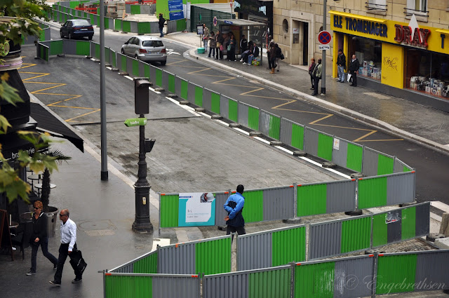 Det här är jättekul. Jag berättade ju för ett litet tag sedan om hur 20 byggherrar föredrog att hänga vid byggställningarna ett par dagar för att sedan intensifiera sitt arbete och jobba ett dygnspass, precis här utanför. I fredags när jag vandrade runt med min kamera så gick jag längs Rue Cardinet och anmärkte på att de nästan är helt klara nu. Asfalten är lagd och de hade målat linjer för bilarna och fina cyklister, ja, för cyklisterna. Allt var klart!